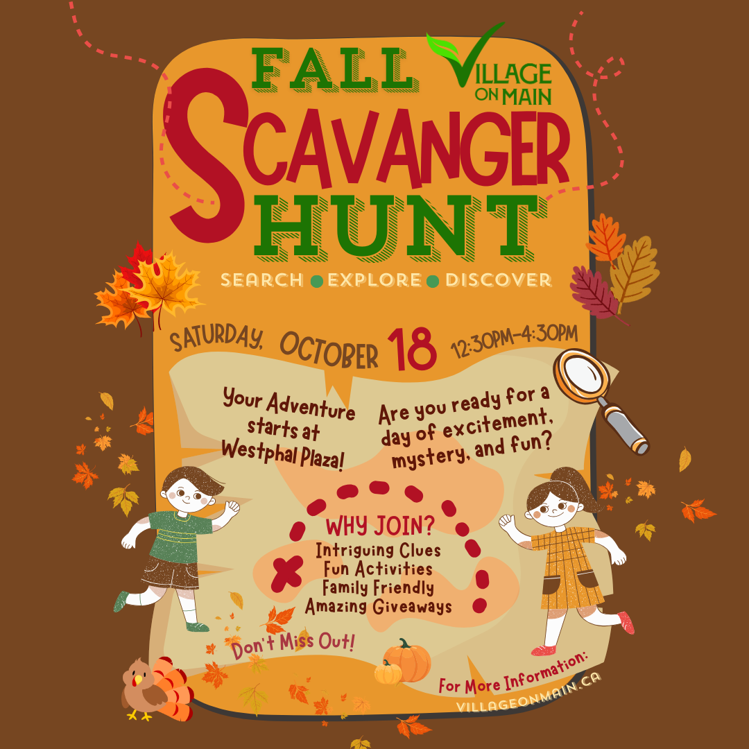 Join us on Saturday, October 18th from 12:30pm to 4:30pm for an afternoon of exploration during our Fall Scavenger Hunt and enjoy special treats, prizes, and giveaways all afternoon in the Village on Main!